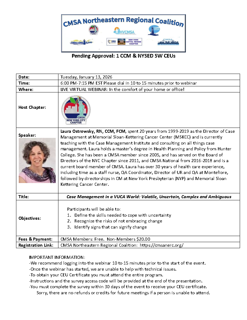 1 SW & CCM credits applied for. FREE CMSA members, $20 non-members.